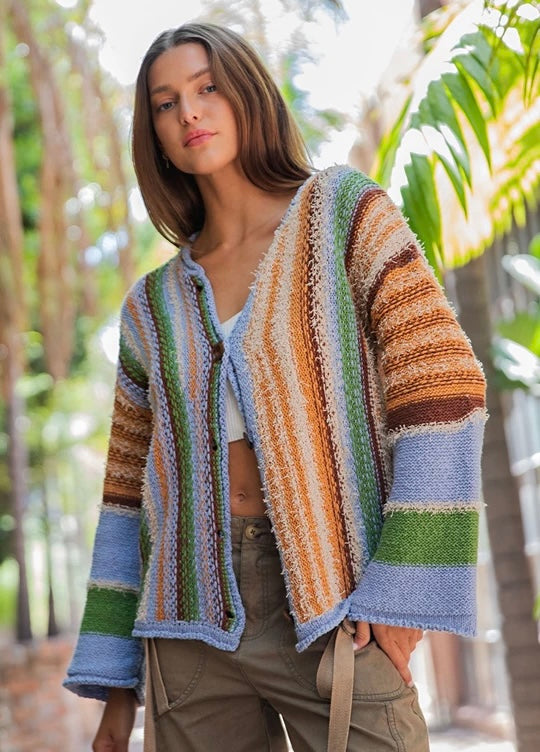 This multi-color button-down sweater highlights a bold vertical stripe pattern in earthy tones that bring warmth and versatility to your wardrobe. Crafted from textured knits, it offers a relaxed fit complemented by flared sleeves and raw edge seaming, creating an artisanal, cozy aesthetic ideal for layering in cooler weather.