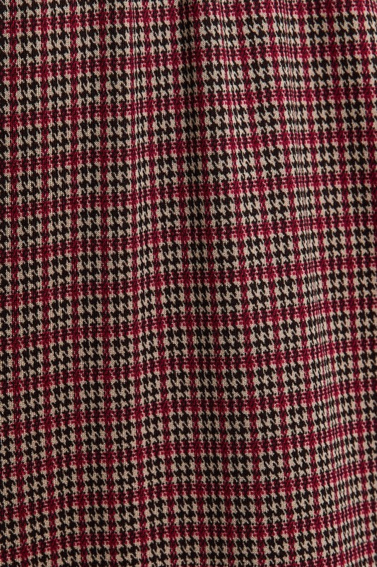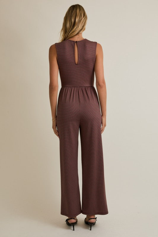 The Twilight Houndstooth Jumpsuit features a sophisticated black, taupe, and burgundy pattern paired with a flattering square neckline, side pockets and bra-friendly straps for comfort. Its subtle wide-leg silhouette enhances your figure, making it an ideal choice for any season. Whether dressed up for special occasions or styled casually, this jumpsuit offers versatile elegance with expert craftsmanship.
