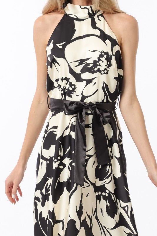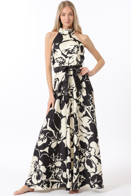 The Black Tie Affair Halter Maxi Dress exudes elegance with its sleeveless, satin-look fabric and sophisticated ivory and black large floral print. Designed with a halter neck that ties at the back, it offers adjustable comfort and a flattering silhouette. The self-tie belted waist enhances your shape while adding a refined detail. Perfect for formal occasions, this maxi dress combines timeless style with modern grace for a standout evening look.