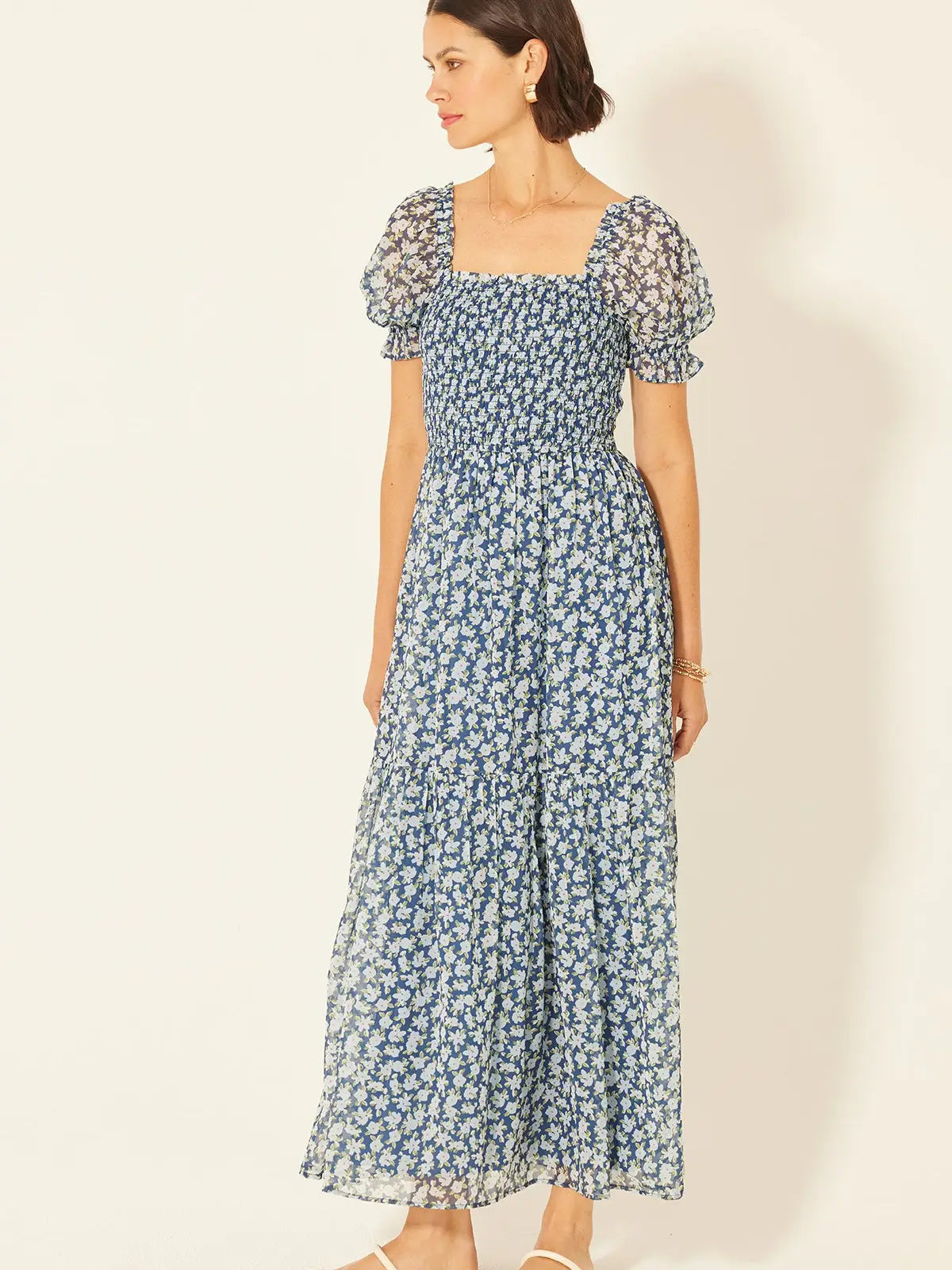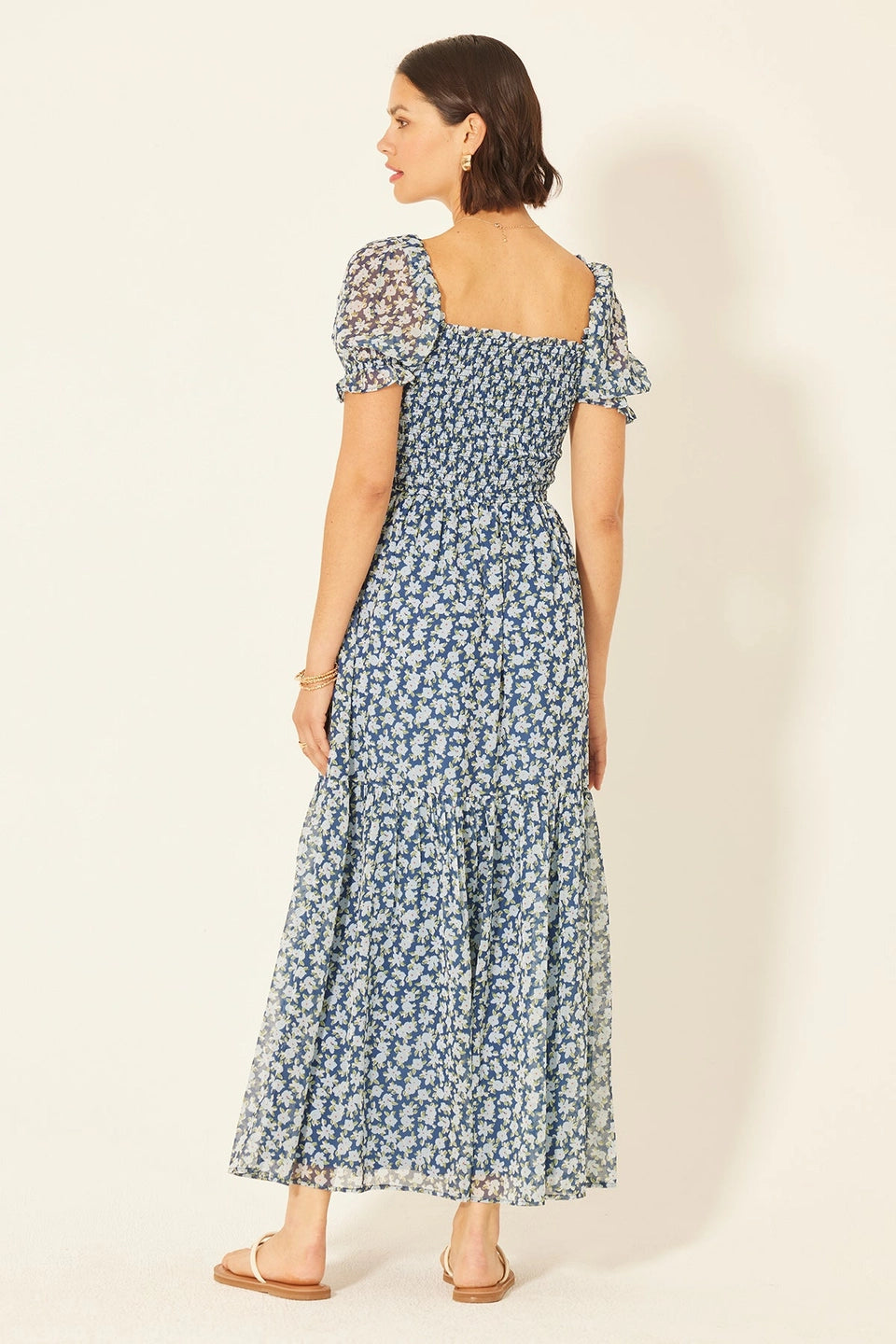 Embrace effortless elegance with this enchanting chiffon midi dress, adorned with an all-over floral print that captures the essence of spring. The smocked bodice provides a flattering, structured fit, while delicate short puff sleeves trimmed with ruffles add a romantic touch. Lightweight and airy, this flowing silhouette moves beautifully with every step, making it perfect for garden parties, bridal showers, or any warm-weather occasion. A timeless piece that transitions seamlessly from day to evening.