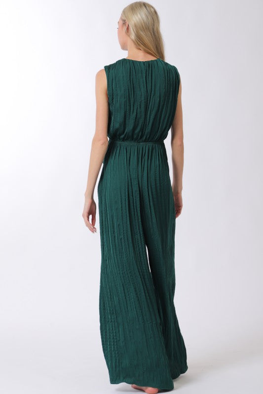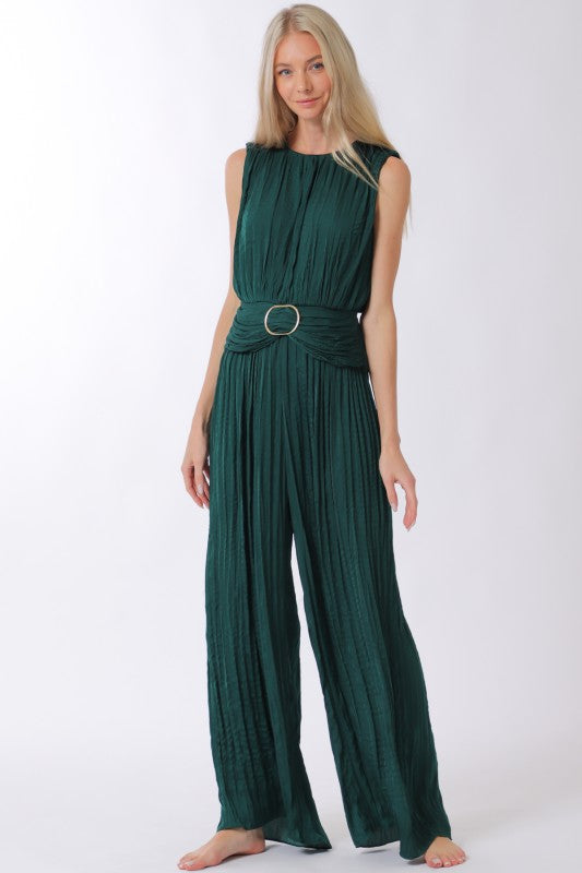 This sleeveless Emerald City Pleated Jumpsuit features a sophisticated design in luxurious silky satin, dyed a rich hunter green. It features a high neckline with a single button closure and an open back for a refined silhouette. A center front buckle and horizontal pleating at the elasticized waist enhance the fit, while vertical pleating and a wide-leg cut create graceful movement. Perfect for sophisticated occasions, this jumpsuit delivers both comfort and striking style.