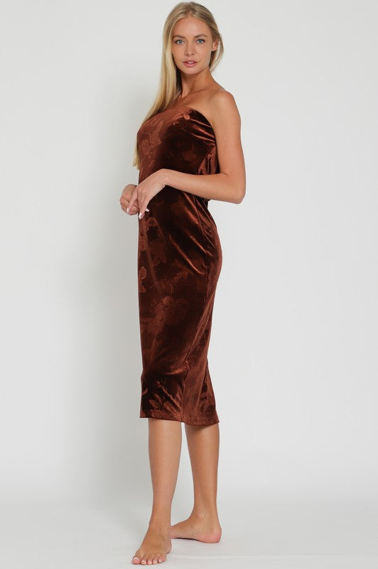 Slip into elegance with this mesmerizing chocolate brown velvet midi dress, featuring a delicate floral burnout pattern that adds a hint of intrigue. The strapless tube neckline pairs perfectly with a velvet tie at the back, while the cowl back detail gives it a sultry, graceful drape. Ideal for making a statement at any special occasion, this dress effortlessly blends playful charm with sophisticated style.
