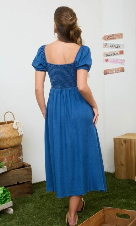 Embrace effortless charm in this delightful denim midi dress, where sweet details meet everyday versatility. The smocked bodice hugs gently while puff sleeves add a playful touch, and a darling bow tie adorns the square neckline for that extra dash of personality. The light, airy skirt flows beautifully, making it equally perfect for breezy summer days or layered autumn adventures. Simple, sweet, and endlessly wearable—your new go-to for looking put-together without trying too hard.