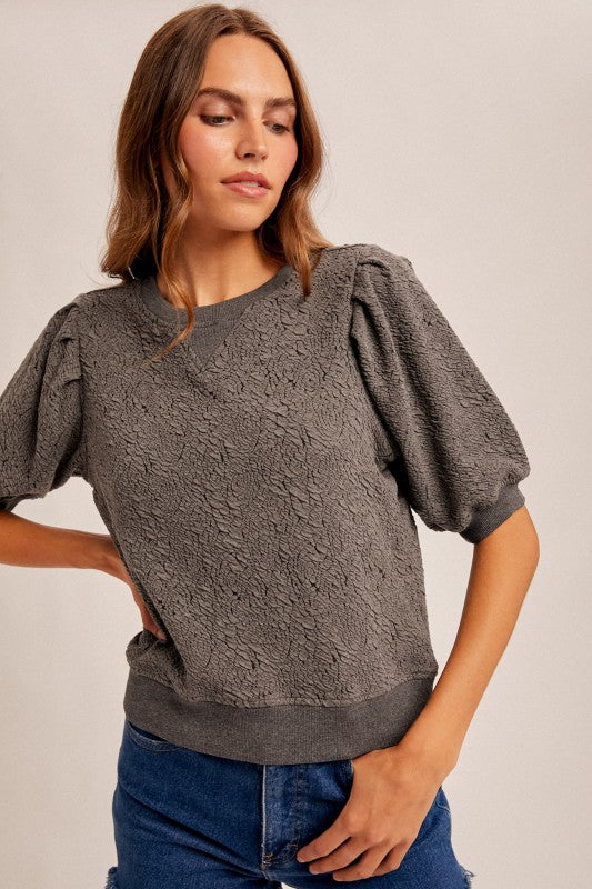 Elevate your everyday style with this stunning jacquard top that does it all. The rich charcoal hue features an intricate floral texture that adds instant sophistication, while the round neckline and adorable bubble sleeves keep things fun and fresh. Throw it on with jeans for effortless casual vibes, or pair it with tailored trousers and heels to turn heads at dinner. Versatile, chic, and ready for whatever your day throws at you—this is the top that works as hard as you do.