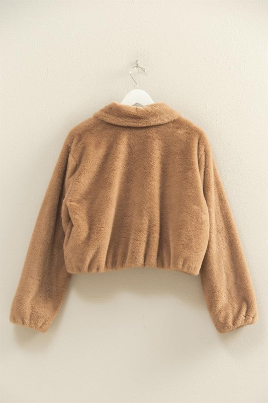Stay warm without sacrificing style in this Cozy Mood Faux Fur Zip Jacket. The plush collar brings an unexpected edge to timeless outerwear, making it your go-to layer when temperatures drop. Zip it up over your favorite long sleeve tee or lightweight sweater for an effortlessly chic look that works from casual coffee runs to weekend hangouts. Perfect for those moments when you want comfort that actually looks good.