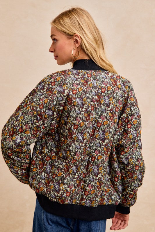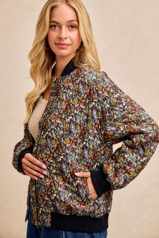 Bloom into style with this charming floral quilted jacket that's equal parts cozy and chic. Featuring an all-over floral print, this bomber-silhouette stunner boasts a rounded neckline with a contrasting band that adds just the right pop of personality. Long sleeves keep you warm while the quilted construction delivers that perfect lightweight layer for crisp days. Whether you're running errands or meeting friends, this jacket proves you can absolutely have it all—comfort and fashion-forward flair wrapped into one fabulous piece.