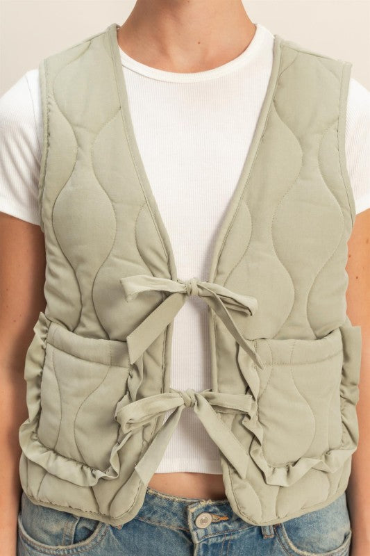 Add a fun twist to your outfit with the Vianna Tie Front Quilted Vest! Its quilted texture and tie-front detail create a flattering shape while the patch pockets keep it cool and practical. Lightweight yet cozy, this vest layers perfectly over a sleek turtleneck or breezy blouse. Whether you're out for a casual stroll or dressing up for a polished look, it’s the playful, versatile piece your wardrobe’s been waiting for.